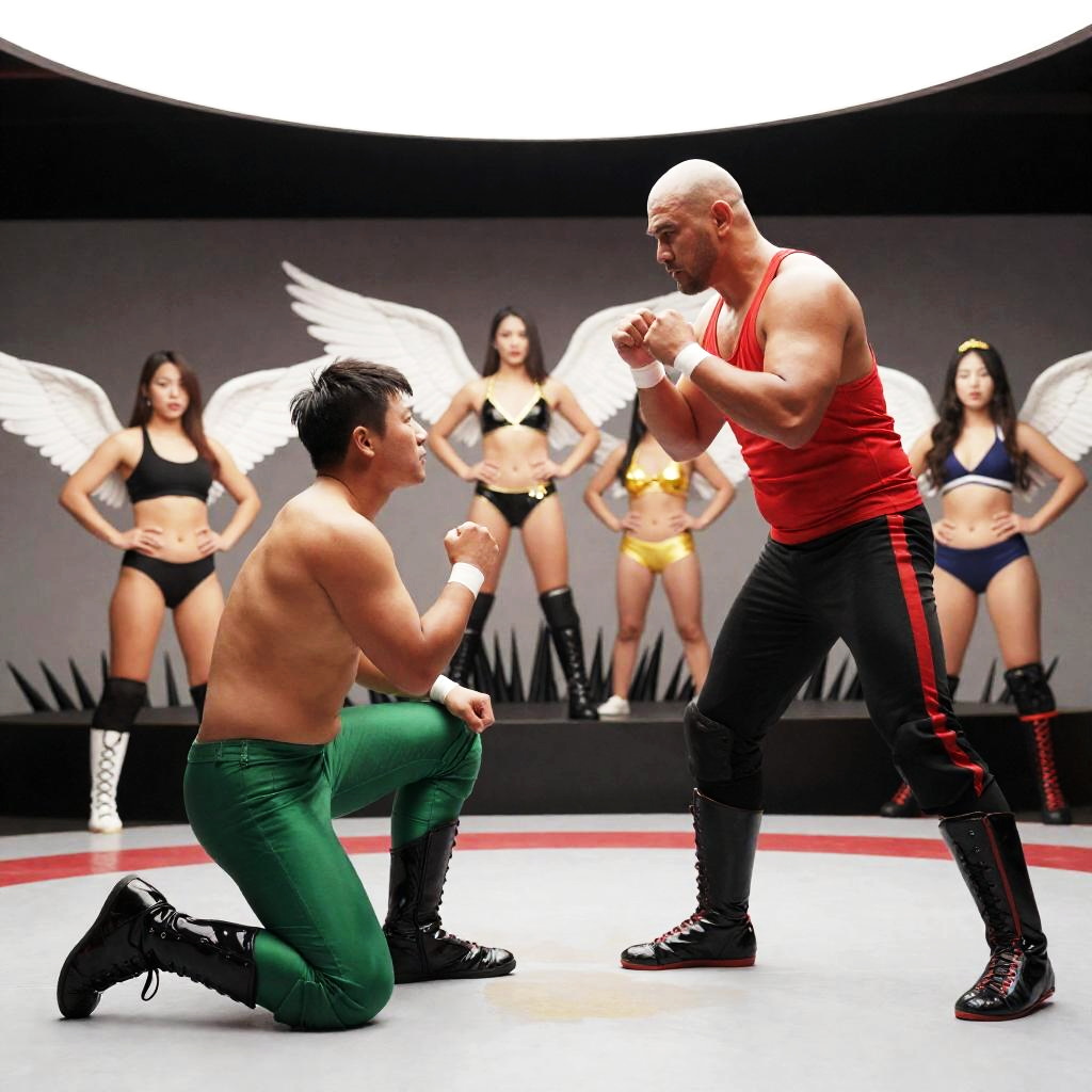 Photograph of a wrestling match. Bald man in red tank top and black pants stands in a fighting stance on the right, facing a man in green pants and shirt kneeling on the left. Background has a group of women in revealing costumes and wings. Circular stage with black spikes. Women in the background are standing, hands on hips, looking intense. Large circular light fixture above. Bright, indoor setting.