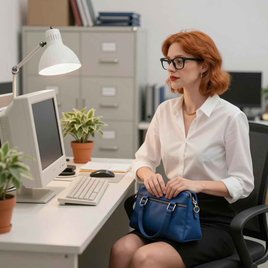 Two people in an office. Blonde man with wavy hair, blue shirt, jeans, holding a pen, facing a woman. Woman with dark hair in an updo, wearing a white lace top and gray skirt, hands on hips, standing. Office desk with a white bag, black phone, and papers. Map and blueprints on the wall. White curved window on the left. Man looking at woman, woman looking at man.