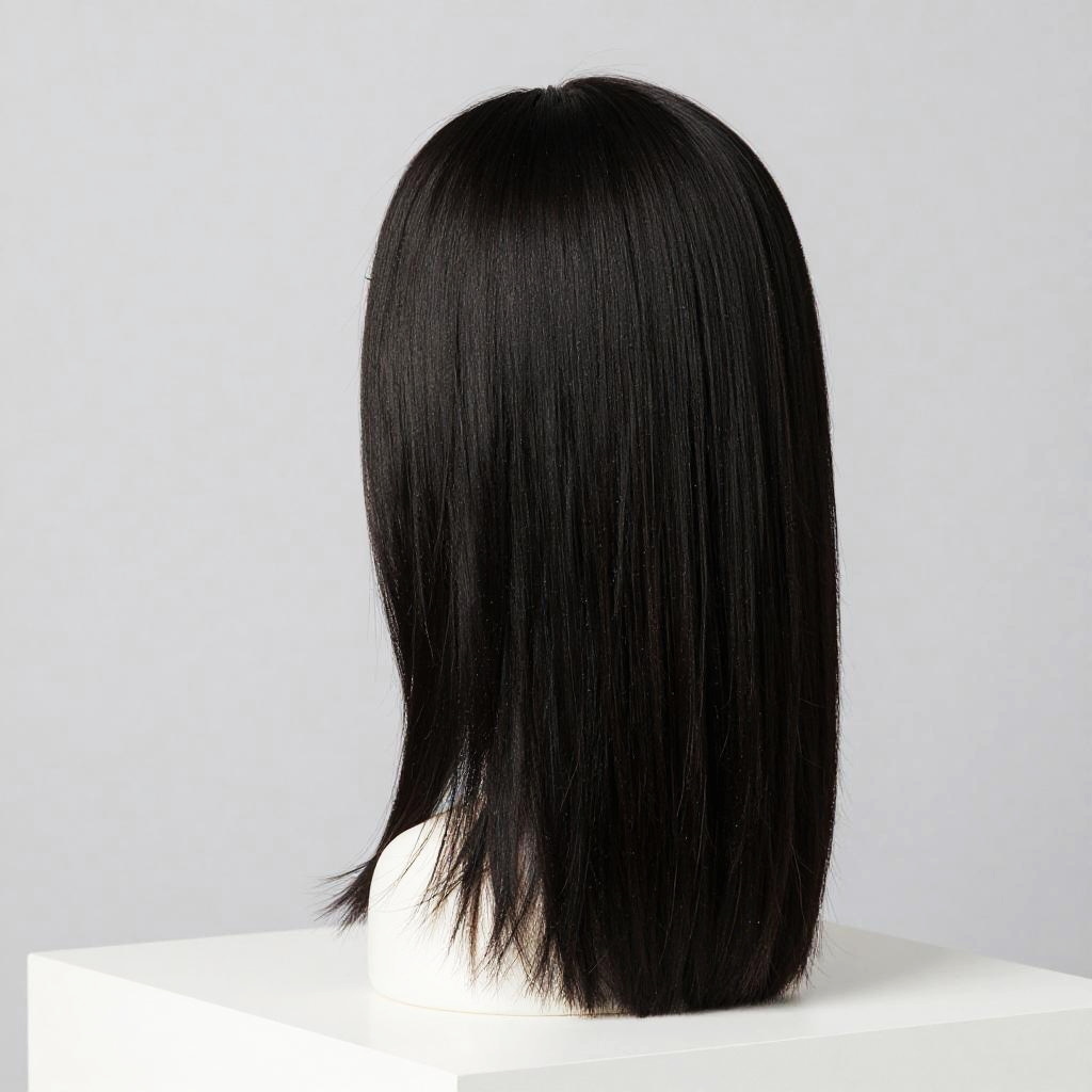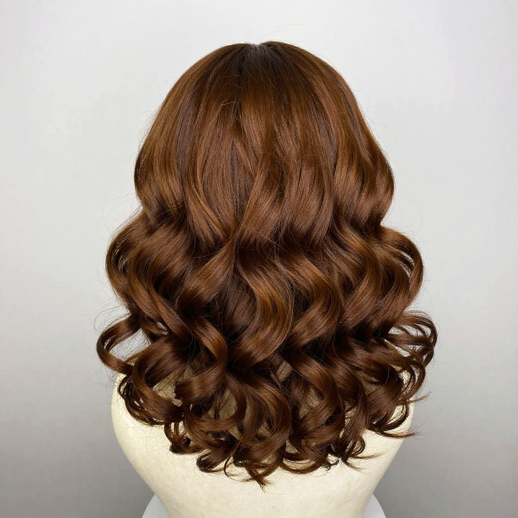 Full bottom wig styled in voluminous loose curls, vibrant chestnut brown color, soft natural shine, realistic texture, displayed on a modern mannequin in bright studio lighting