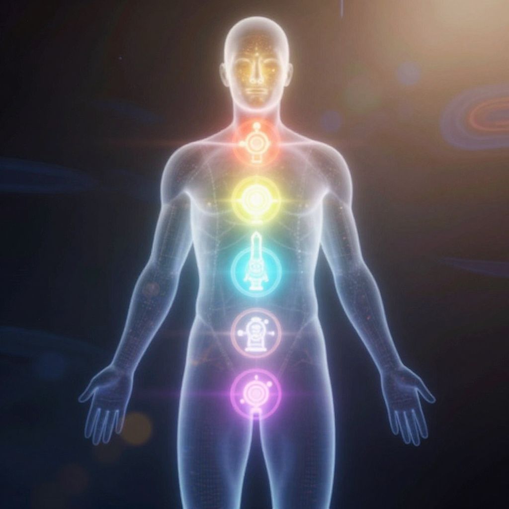 Digital CGI of a glowing, translucent human figure with neon-colored chakras: yellow crown, blue throat, green chest, orange abdomen, red lower