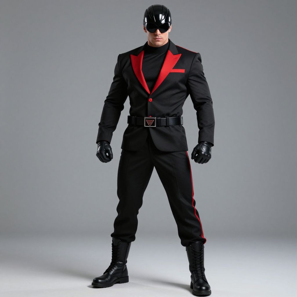 A muscular man with a determined expression, wearing a sharp black suit with striking red accents, black gloves, and black boots. He has a prominent belt featuring a visible logo on it, and is also wearing a sleek, stylized helmet.