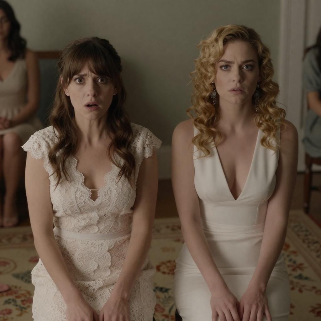 Photograph of two women in a dimly lit room. Woman on left has brown hair, white lace dress, shocked expression. Woman on right has blonde curly hair, white deep-cut dress, silver earrings, intense gaze. Background includes partial figures, scattered objects, floral carpet.