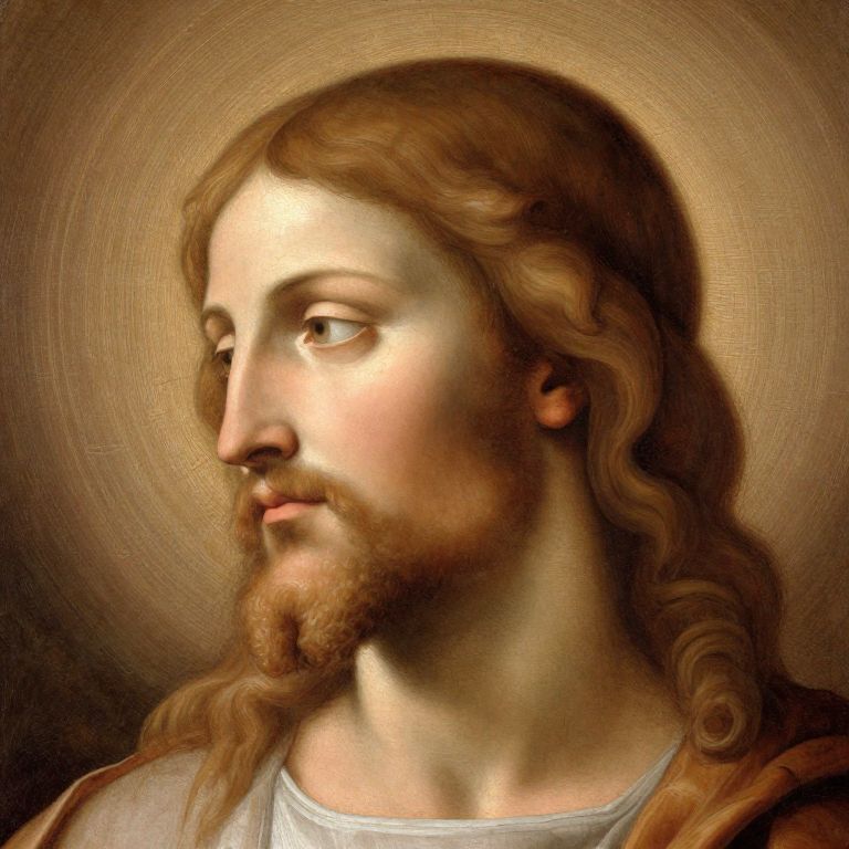 Side profile of Jesus depicted in classical Renaissance style, soft glowing light illuminating serene face, gentle expression with flowing hair and beard, subtle halo behind head, warm earthy tones with detailed textured brushstrokes, peaceful spiritual atmosphere.