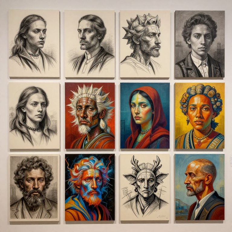 Drawings styles exploration, a vibrant collage showcasing diverse artistic techniques from charcoal sketches to colorful digital paintings, intricate details, dynamic textures, blending traditional and modern aesthetics, atmospheric lighting, high resolution, art gallery display