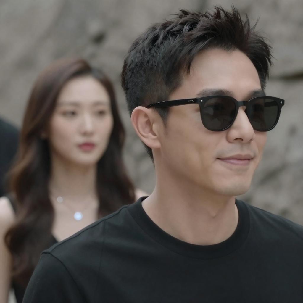 Photograph of a man with dark hair, sunglasses, and a black shirt, smiling slightly. A blurred woman with long hair and a shiny necklace is in the background. Both are outdoors with a rocky background. The man is in the foreground, facing right.