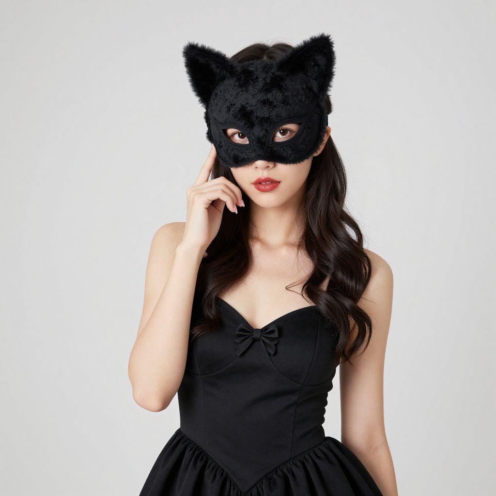 Photograph of a fair-skinned woman with long, wavy black hair, wearing a black cat mask with furry ears, red lipstick, and a strapless black dress with a bow at the chest. She has a slender build and is touching her mask with her right hand. The background is plain white, making her the sole focus. The image has a high-contrast, studio-lit style, emphasizing the textures of the mask and dress. Her expression is neutral yet slightly inquisitive.