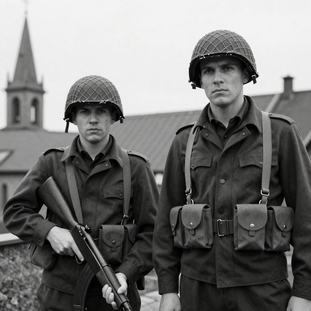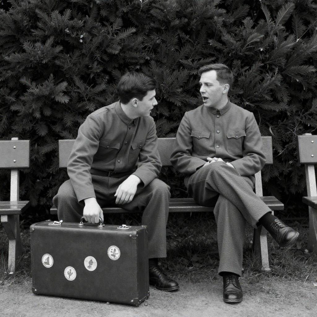 Black and white photograph of two men in early 20th-century uniforms sitting on a bench. Both men hold large suitcases; one has stickers on his suitcase. Man on left leans forward, man on right sits with legs crossed, mouth open. Dense hedge background, grassy ground, two empty benches.