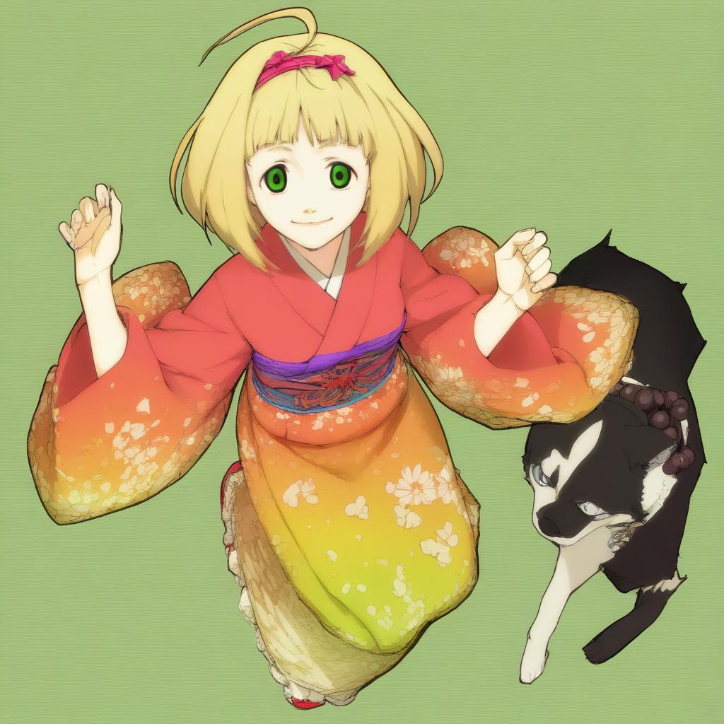 Moriyama shiemi, ao no exorcist, 1girl, green eyes, blonde hair, short hair, ahoge, hairband, kimono, by artist shiba itsuki, leet
