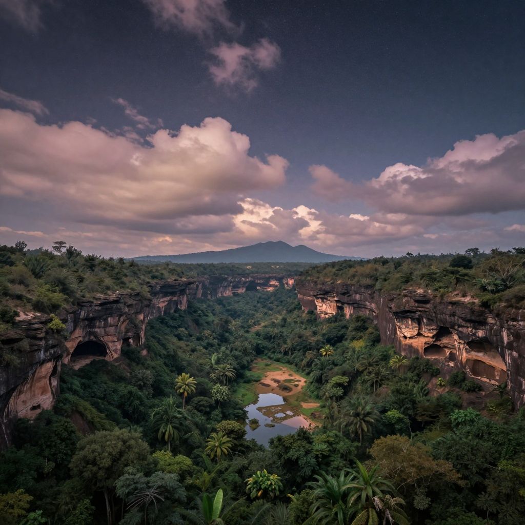 Photograph of a lush, tropical jungle canyon with towering cliffs, dense greenery, a small pond, and a mountain in the background under a dramatic