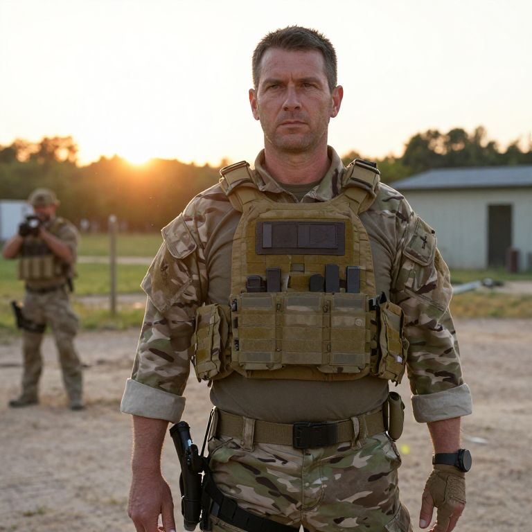 A realistic scene of a tactical field operator in his 50s, standing in a well-maintained outdoor training facility with camouflage gear and a tactical vest, the holstered handgun clearly visible at his side, face focused and alert, sun setting behind him with a natural outdoor environment and subtle dust particles in the air.