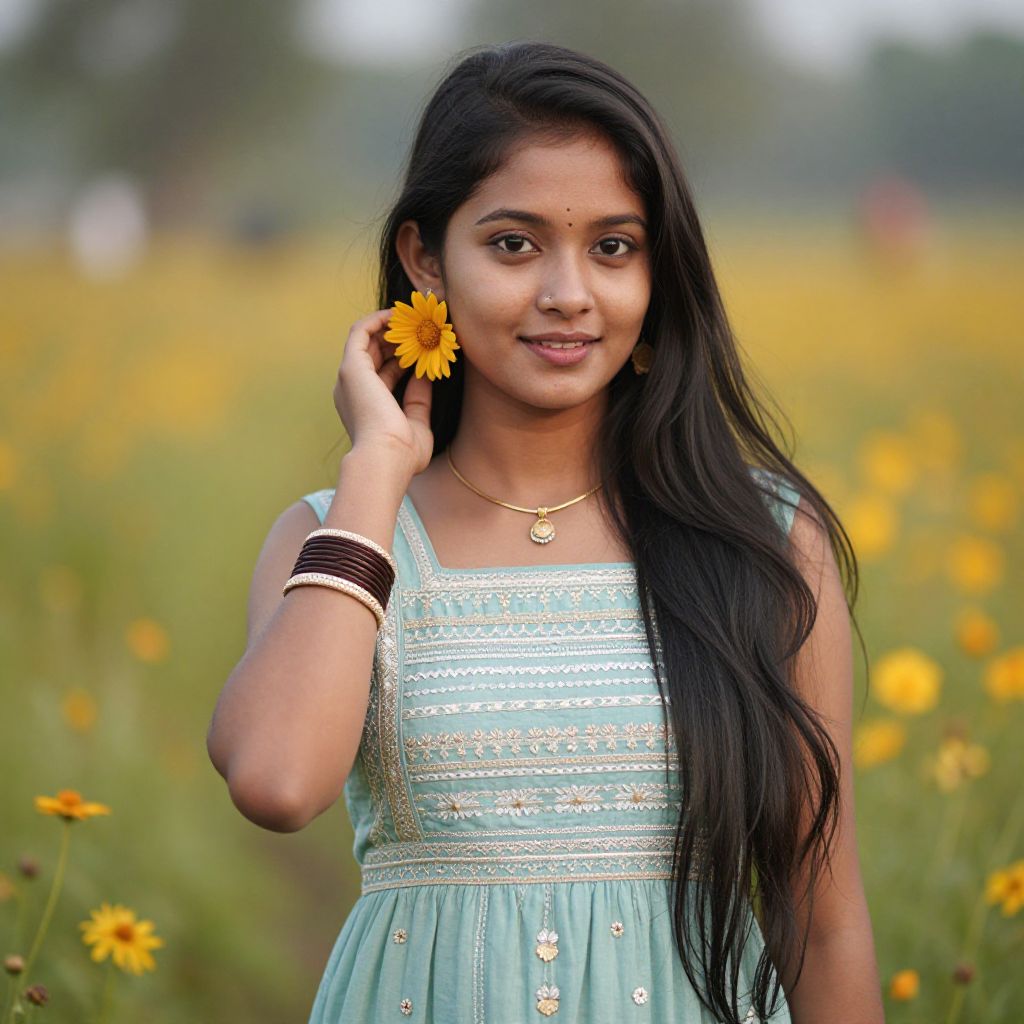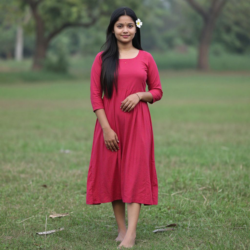 "red sharara suit, 1girl, solo, black hair, barefoot, long hair, flower, dress, realistic, outdoors, photorealistic, standing, pink dress, grass, full body Realistic photo of casual sexy person with pretty face"