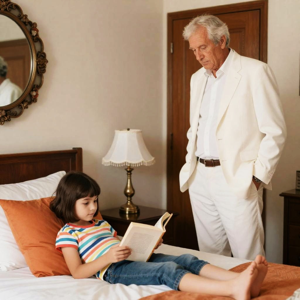 Photograph of a bedroom. Older man in white suit, standing with hands behind back, looking at young girl. Young girl with bob haircut, lying on bed, reading book, wearing colorful striped shirt. Bed with orange pillows, white lamp with frilled shade. Ornate mirror with flowers on left, wooden door in background.