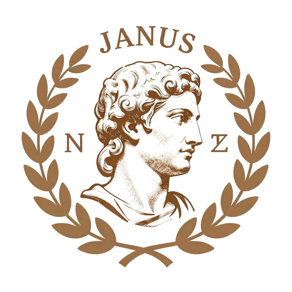 This is a digital drawing in a classical style featuring a monochromatic brown profile of a man with curly hair, reminiscent of ancient Roman sculptures. The man's face is turned slightly to the right, with detailed shading highlighting his nose and lips. Surrounding his head is a circular wreath made of brown laurel leaves. Above and below the man's head, the letters "JANUS" and "NZ" are prominently displayed in uppercase, brown, serif font. The background is plain white, emphasizing the simplicity and elegance of the design. The overall composition is symmetrical and formal, evoking a sense of historical reverence.