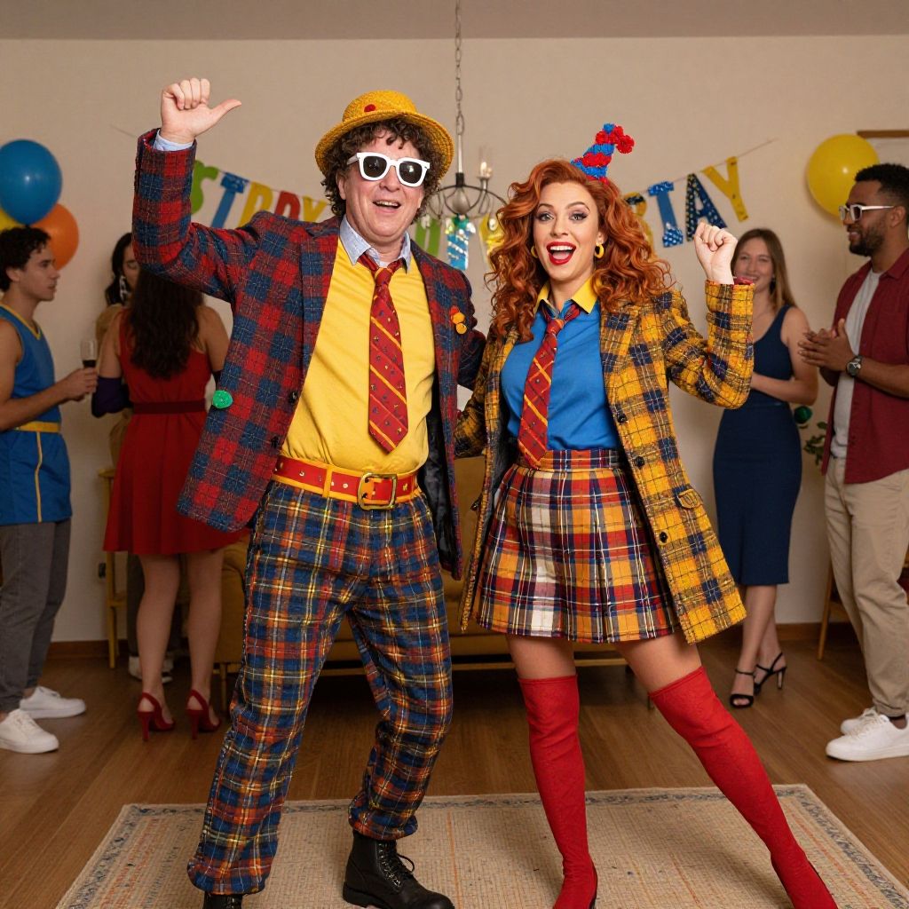 Photograph of a lively party scene featuring a male and female clown duo at the center. The man wears a yellow shirt, red tie, plaid jacket, and pants, with a yellow hat and white sunglasses. The woman sports a blue shirt, red tie, plaid jacket, and short skirt with red knee-high boots, and a red bow in her curly red hair. Both are smiling and raising their hands. Background includes party decorations, balloons, and several casually dressed guests. The setting is a wooden-floored room with a beige rug. Bright colors and playful atmosphere dominate the image.