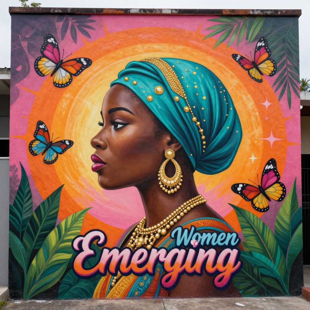 Vibrant mural of a dark-skinned African woman in a turquoise headwrap, gold jewelry, surrounded by orange sun, and colorful butterflies, with