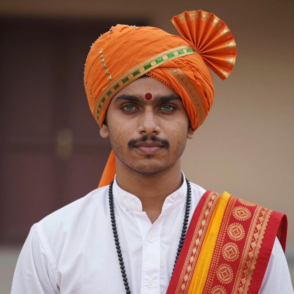 India male national costume, photograph of a young Indian man, medium brown skin, mustache, green eyes, wearing traditional Rajasthani attire, orange turban with green and gold trim, white button-up shirt, red and yellow sari with intricate patterns, red bindi on forehead, black beaded necklace, background blurred with dark and light brown tones, detailed face, neutral expression, natural light, bokeh effect, close-up, portrait, cultural, traditional clothing, vivid colors, realistic ures