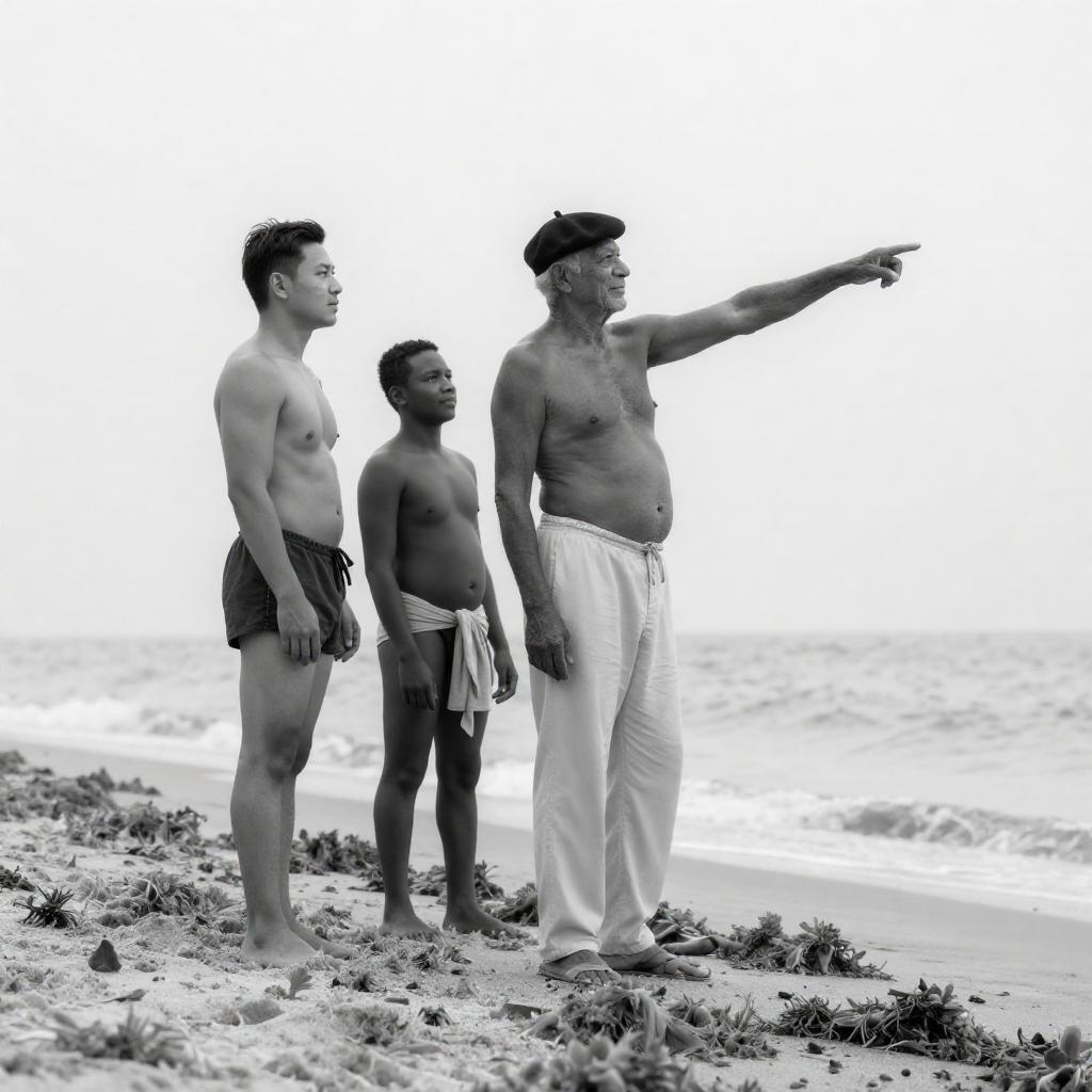 Black-and-white photograph of three men on a beach. A shirtless, muscular man with dark hair stands on the left, wearing dark shorts. A tall, older man in a beret and light pants points to the right, while a shirtless, smaller man with dark skin and a cloth around his waist stands beside him. Dry seaweed is scattered on the sand in the foreground.