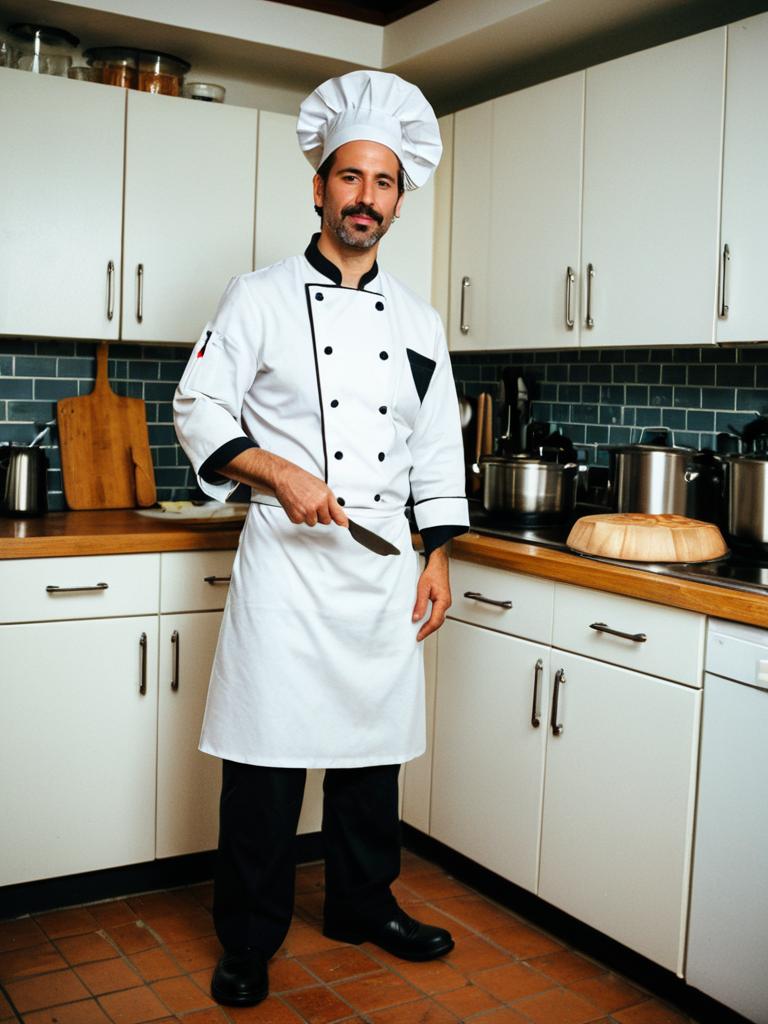 Man in Chef Costume, full-body cosplay photo in kitchen setting