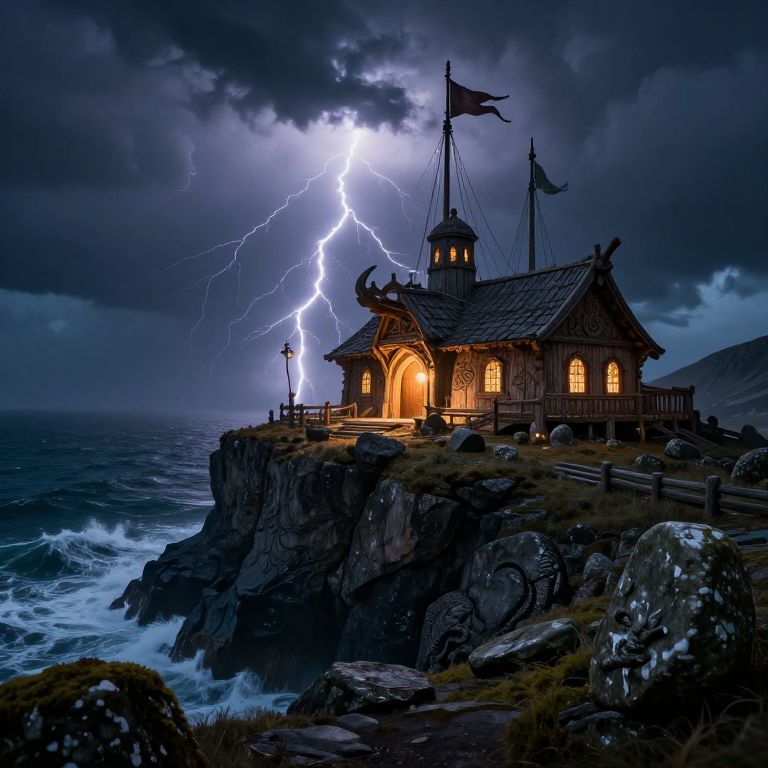 Fantasy Viking longhouse illuminated by stormy lightning, perched atop a rocky cliff overlooking a wild ocean, sails and banners billowing in the wind, detailed wood carvings of Norse mythology creatures, rugged terrain with moss and ancient stones surrounding the structure.
