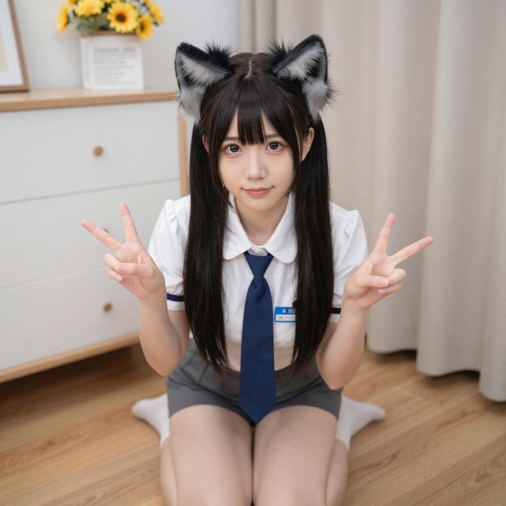 Photograph of an Asian woman with long black hair in twin buns, wearing a black bowtie, white off-shoulder shirt, and black lace thong. She sits on a wooden chair, one leg raised, making a peace sign with her right hand. Her expression is neutral, with light makeup and pink lips. The background is a bright white wall.