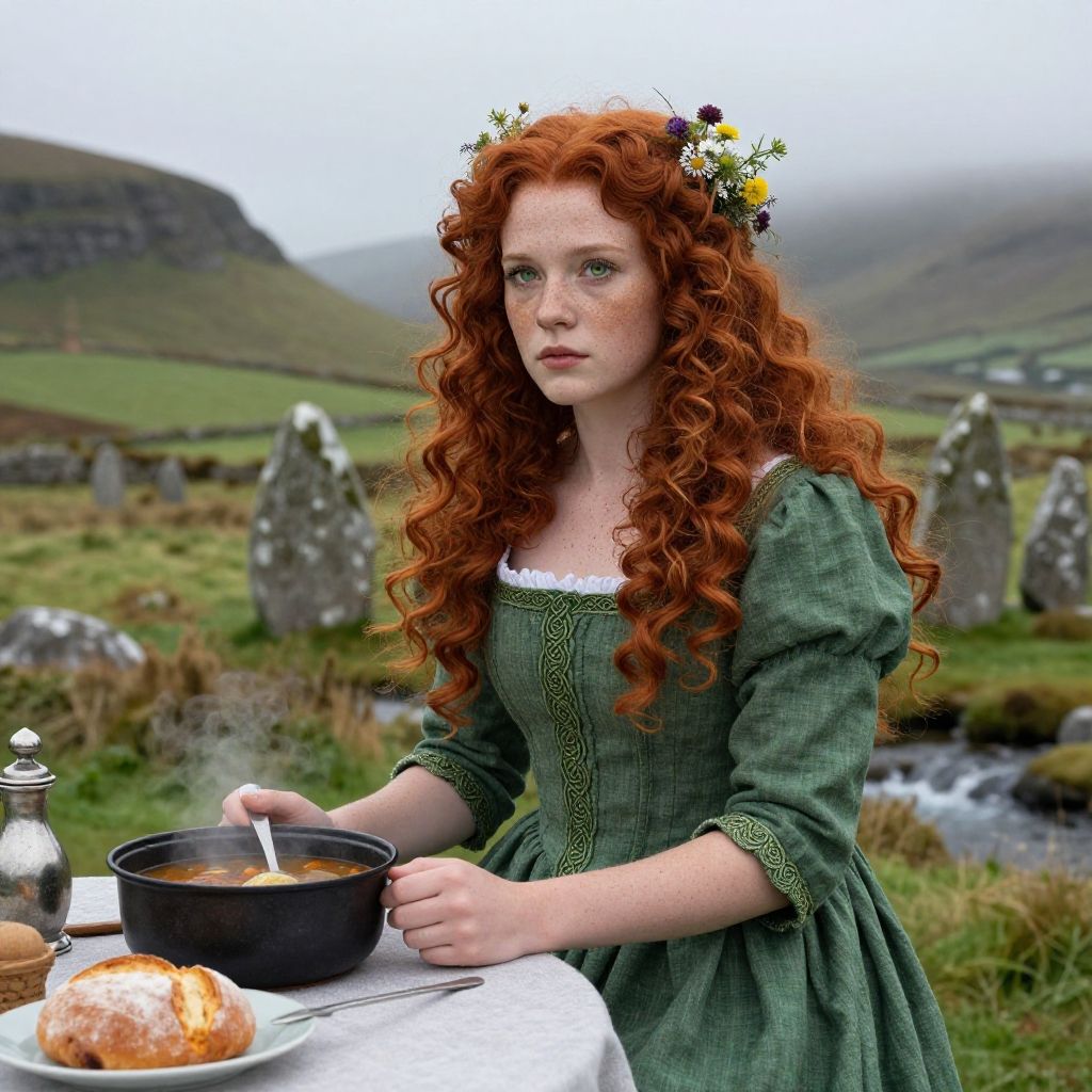 Hyperrealistic art Irish Maid (Whiskey Whispers): A (spirited colleen:1.1) with (freckles:1.2) freckles like constellations on her fair skin, eyes as warm as the golden hues of aged whiskey, dressed in a dress the color of amber and oak, her (curly red hair:1) ablaze in the glow of flickering candlelight, adorned with ribbons and thistle. Enveloped in the warmth of an Irish tavern, with hearty laughter, clinking gadult lasses, a table set with hearty fare and amber whiskey, overlooking roaring fires and jovial camaraderie. . Extremely high-resolution details, photographic, realism pushed to extreme, fine texture, incredibly lifelike