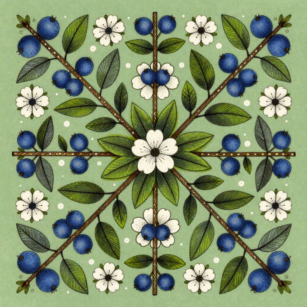 This is a detailed, colorful digital drawing in a folk-art style. The image is filled with overlapping, intricately patterned branches adorned with small, white flowers, green leaves, and clusters of blue berries. The background is a muted green, adding contrast to the bright flowers and leaves. The lines are bold and black, creating a sense of depth and texture.