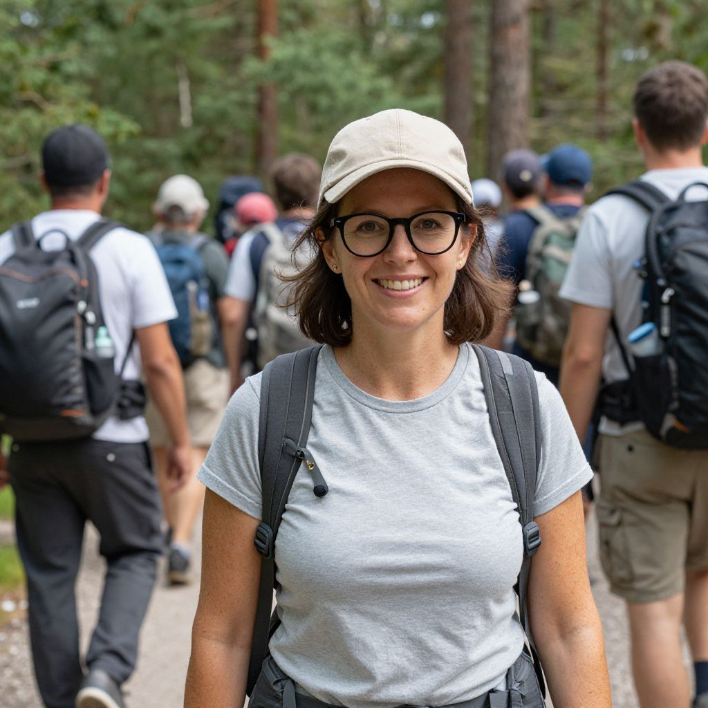 Smiling woman wearing a beige cap, black-framed glasses, and a gray t-shirt stands prominently in the foreground, surrounded by a group of hikers carrying backpacks as they traverse a forested trail.