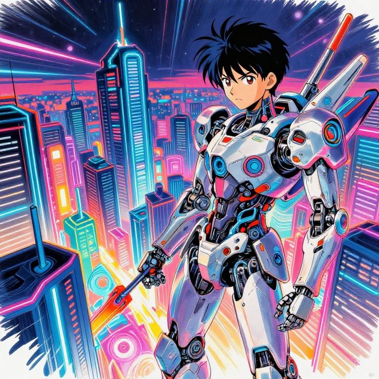 Anime AI drawer creating a futuristic cityscape sketch, vibrant neon colors, dynamic lighting, intricate linework, blending traditional anime style with high-tech robotic elements, showcasing creativity and artificial intelligence synergy in art.