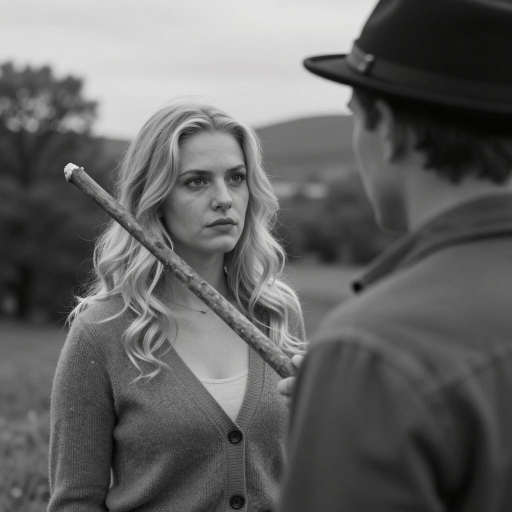 Black and white image of a blonde woman with long hair and an intense expression aiming a handgun directly at the camera. She is wearing a light-colored long-sleeve shirt. The background features blurred vehicles and industrial elements, with the gun barrel prominently in the foreground.