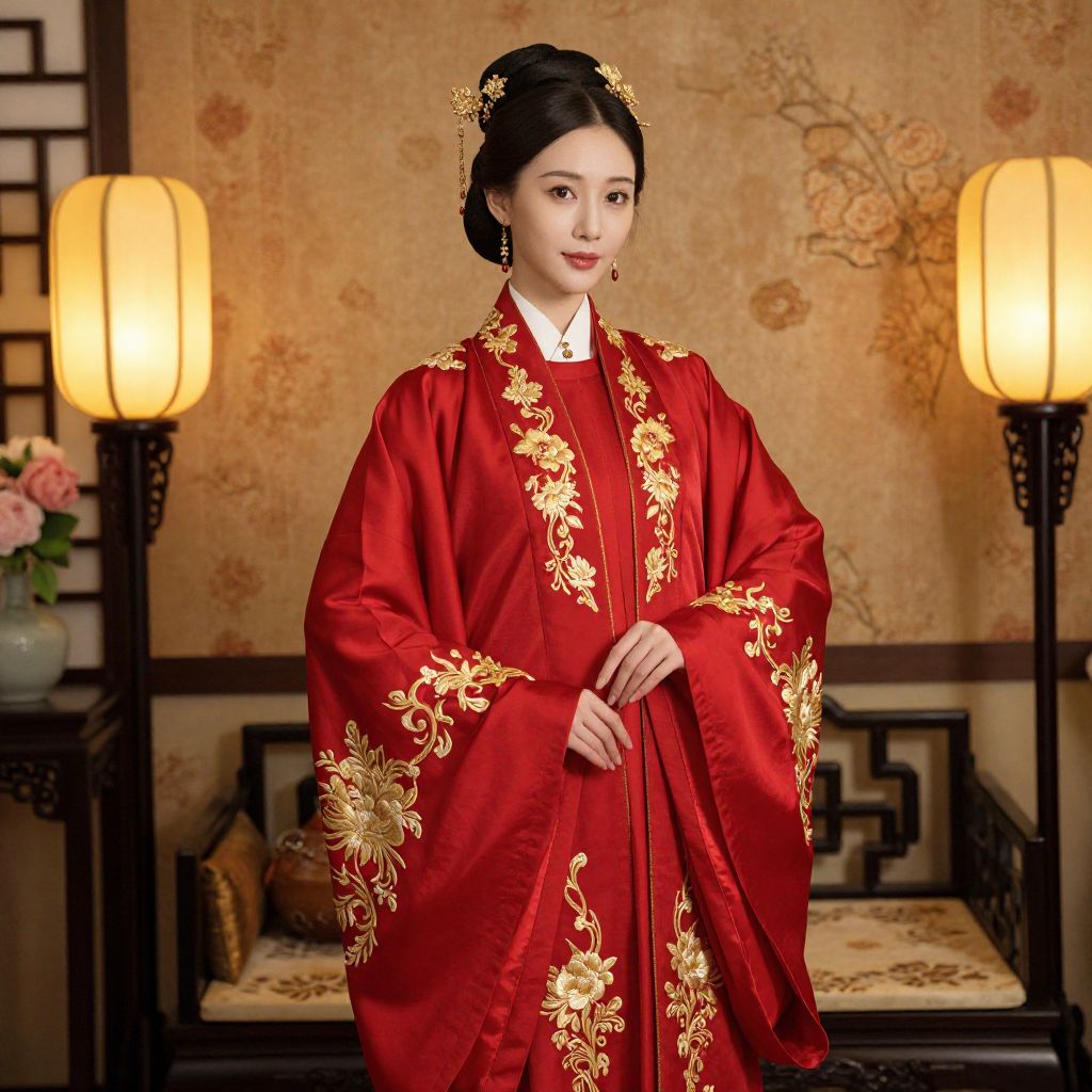 Elegant woman wearing a vibrant red Chinese robe adorned with intricate gold floral embroidery stands gracefully in a warmly lit room, her hand resting gently on her hip as she gazes directly at the camera, surrounded by traditional decor including hanging lanterns, floral arrangements, and patterned wallpaper.