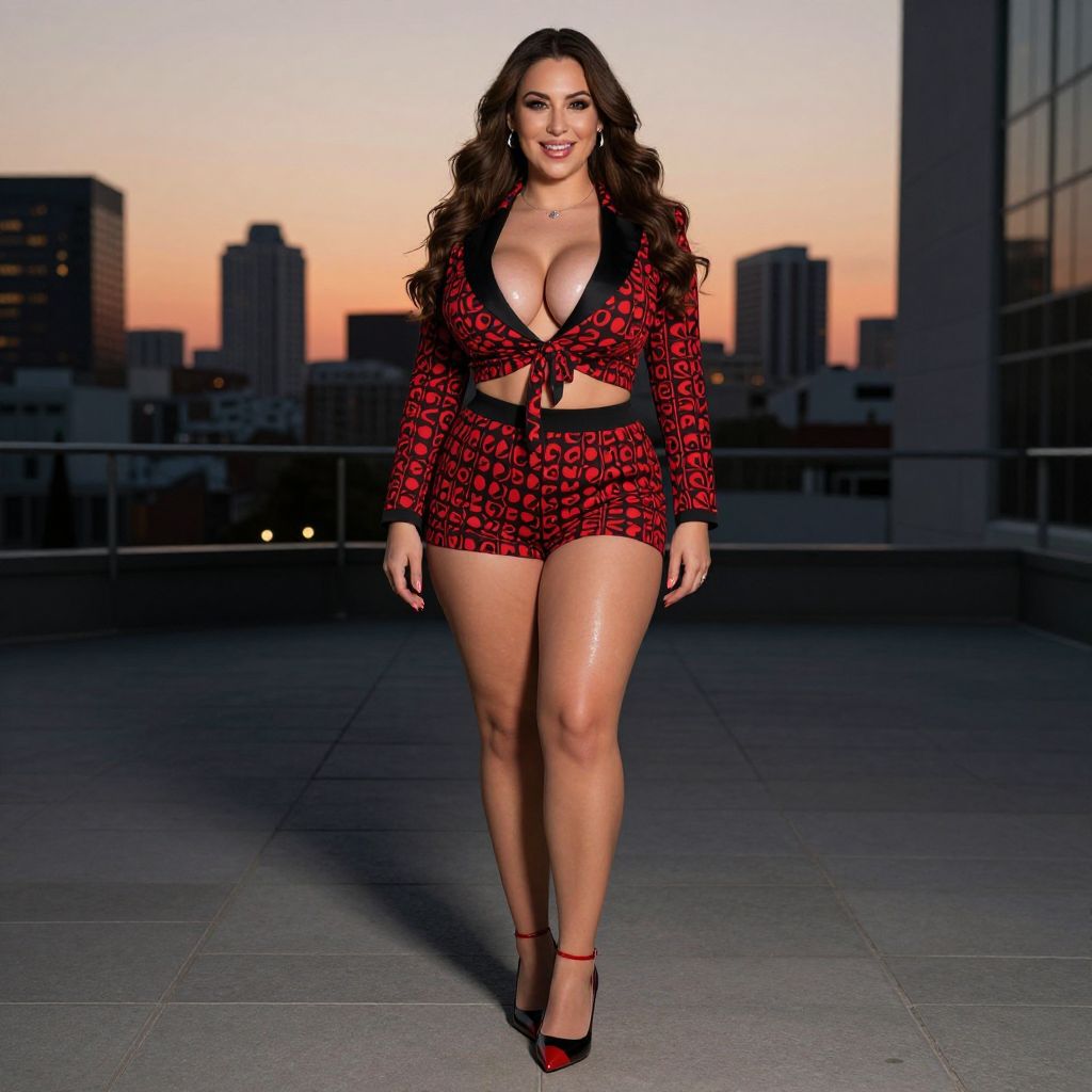 A sexy woman with long brown hair, big tits, and a voluptuous figure, wearing a red and black outfit with a bold patterned design, standing confidently in a modern urban setting. She has a radiant smile and glowing skin, with soft lighting highlighting her curves. She wears black and red pointed-toe shoes that match the outfit's vibrant theme. The background features a city skyline at sunset, adding a dramatic and stylish atmosphere. The overall vibe is bold, sensual, and fashionable.