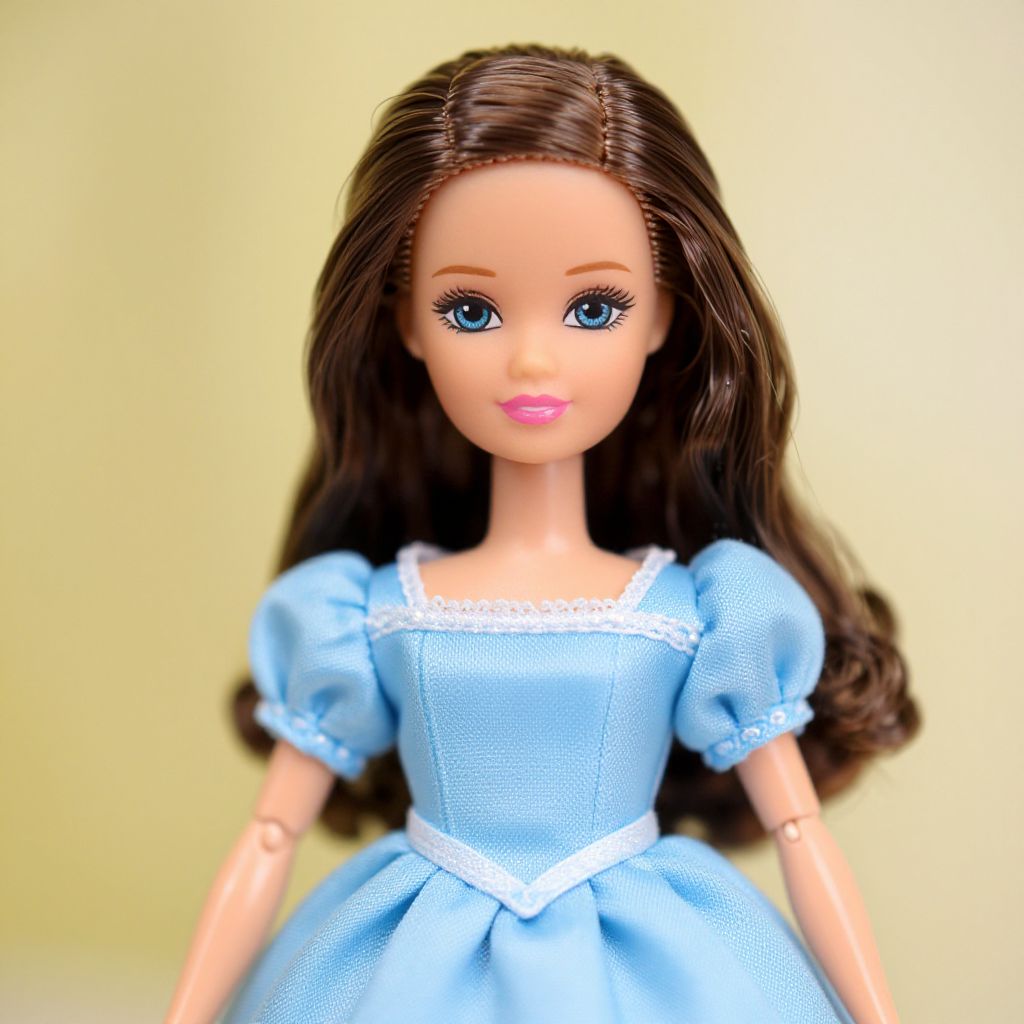 Photograph of a Barbie doll with long brown hair, blue eyes, and wearing a light blue, puffy-sleeved, textured dress. Background