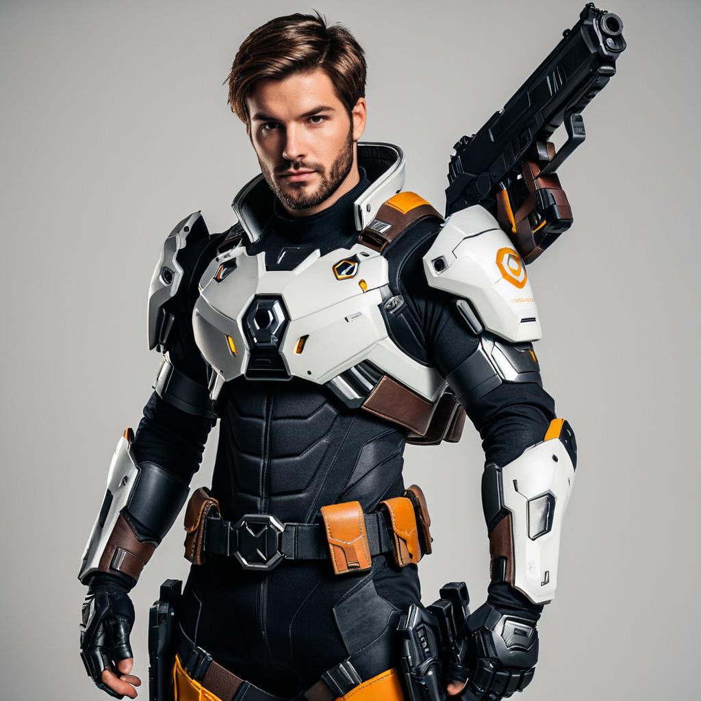 Overwatch soldier costume ,1boy, male focus, solo, weapon, gun, armor, fingerless gloves, gloves, realistic, brown hair, looking at viewer, science fiction, bodysuit, holster, facial hair, belt