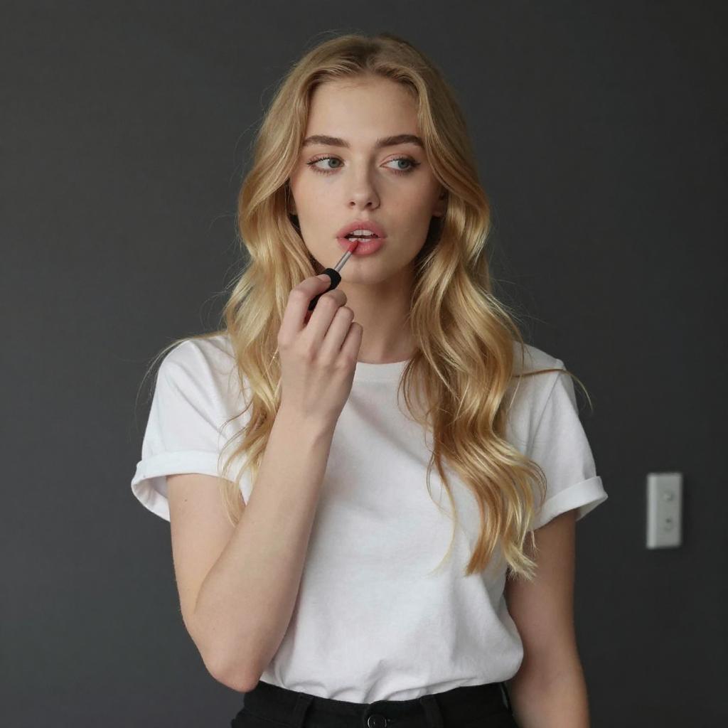 Photograph of a young woman with long, straight blonde hair, wearing a black sleeveless top and white patterned pants. She holds a black marker in her right hand, smiling with red lipstick, against a graffiti-covered wall and old radiator.