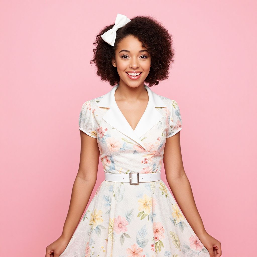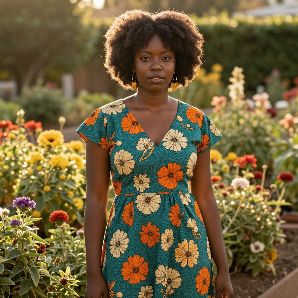 Black woman with curly hair wearing a blue hat with a white flower on it and a blue shirt with a blue collar. The woman is wearing an orange dress with a floral pattern and a red belt.