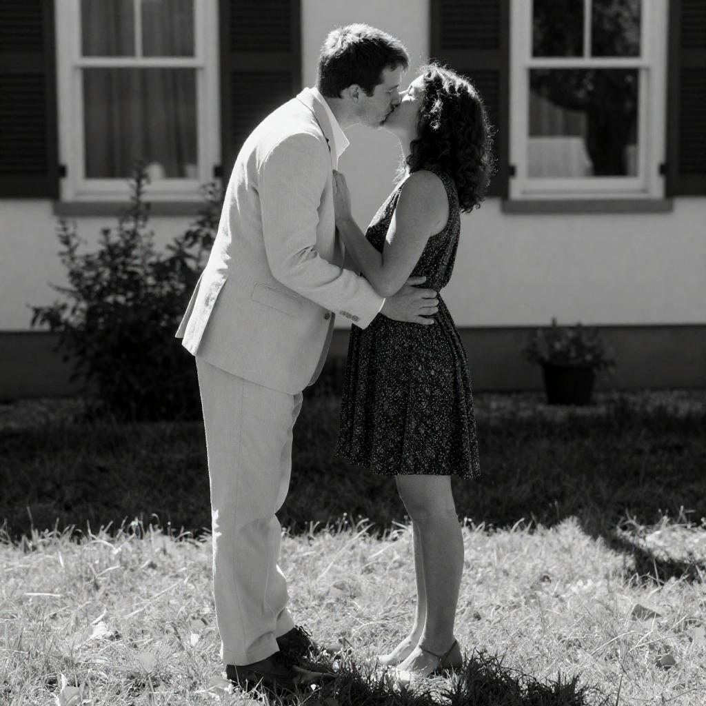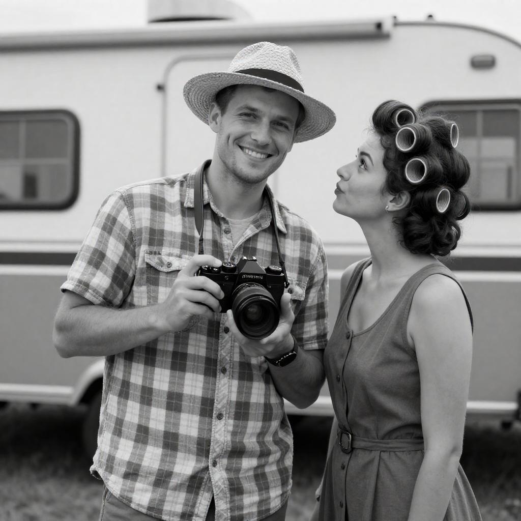 Black-and-white photograph of a man and woman. Man in plaid shirt, straw hat, smiling, holding large film camera. Woman in sleeveless dress, dark hair in large curlers, looking up at him. Background includes trailer and window. Man's left hand on camera. Woman's right hand at side. Both focused on camera.