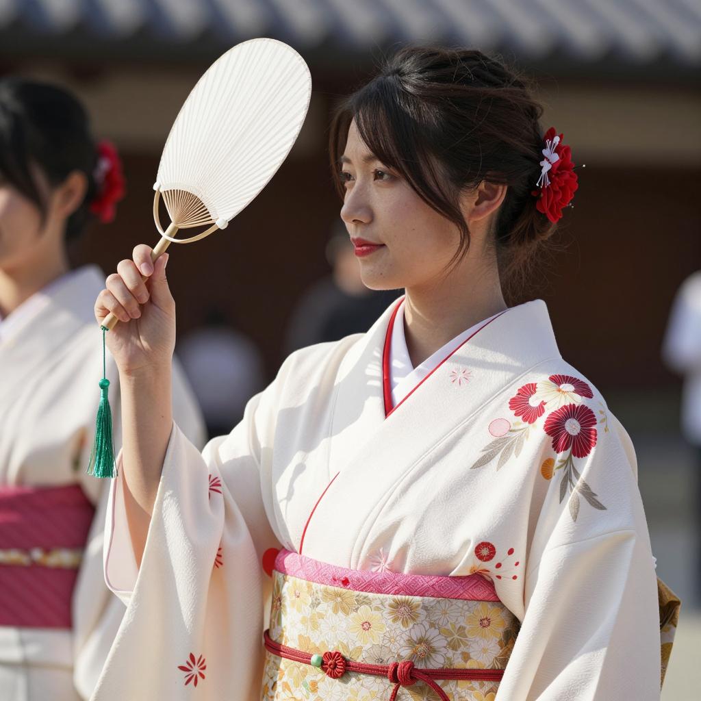 Japanese woman with light skin and black hair in a side ponytail, wearing a white kimono top and red hakama. She holds a wooden bamboo broom diagonally across her body. Background has vertical wooden slats. Image is a photograph. Her eyes are slightly downcast. Text in bottom left corner.