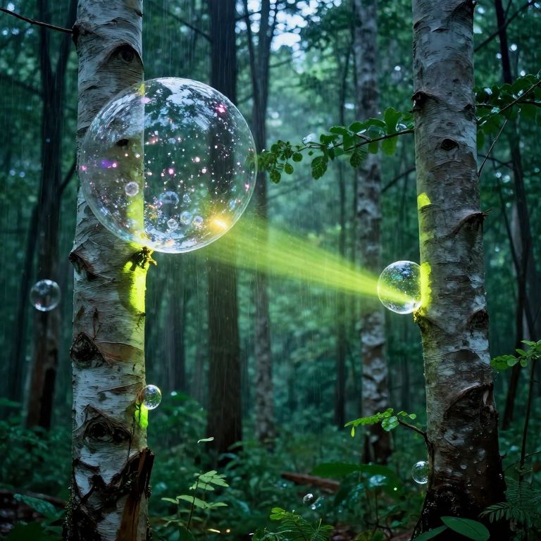 Trees with gelatinous bark bubble like soda bottles after a rainstorm, releasing rays of neon light and sweet melodies into the forest air.