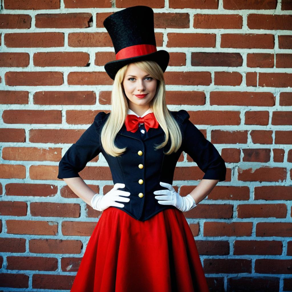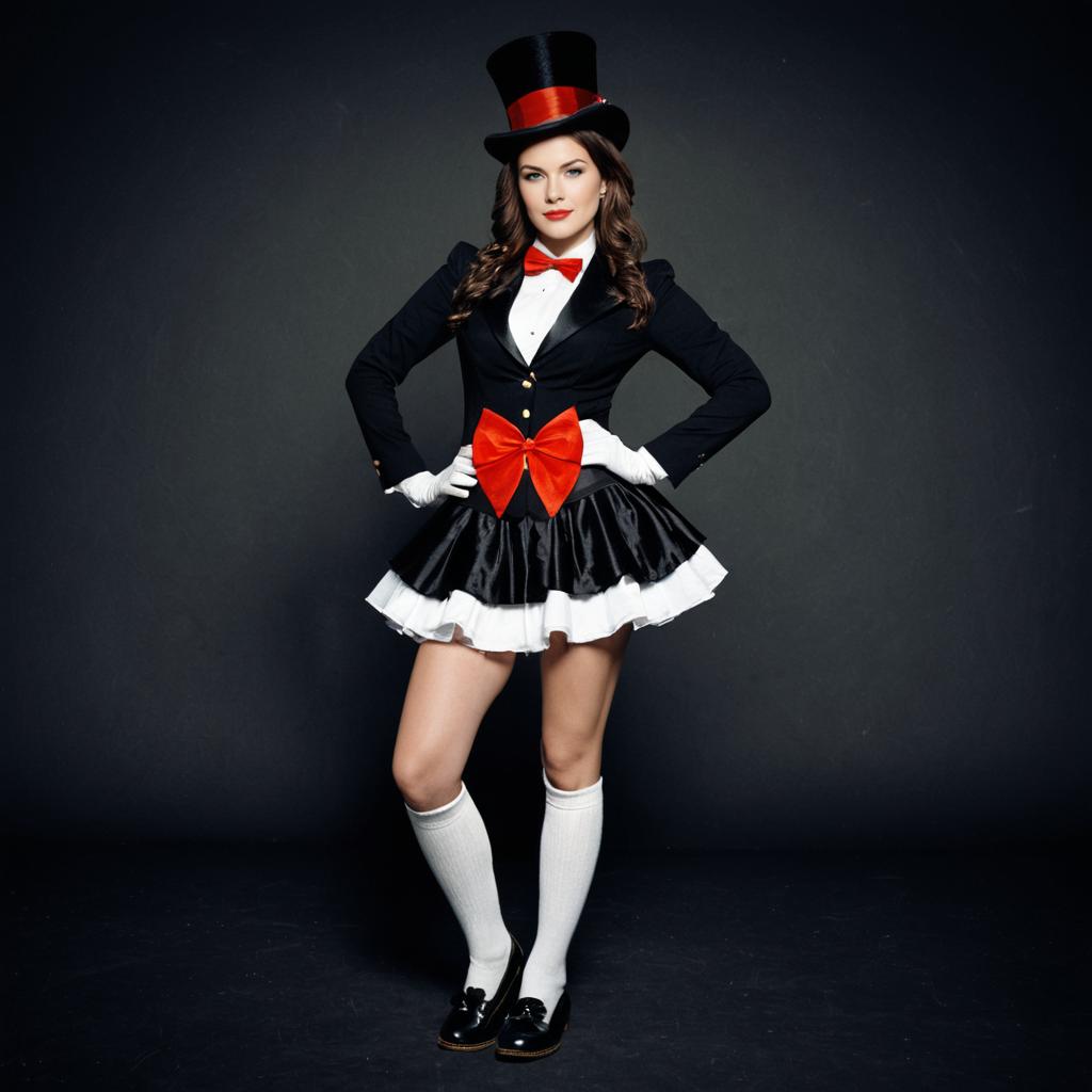 Woman ringmaster halloween,1girl, solo, hat, top hat, socks, brown hair, full body, white socks, skirt, hands on own hips, bow, standing, red lips, bowtie, flower, red bow, black footwear, looking at viewer, black headwear, kneehighs