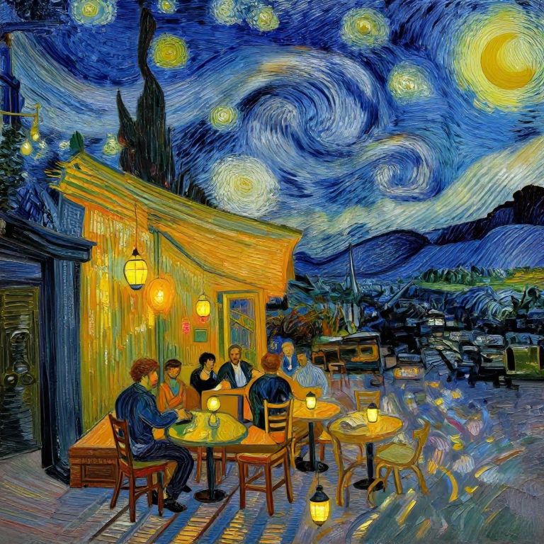 Van Gogh cafe scene at night, swirling starry sky overhead, vibrant brush strokes, glowing lanterns on tables, lively patrons in impressionist style, warm golden hues