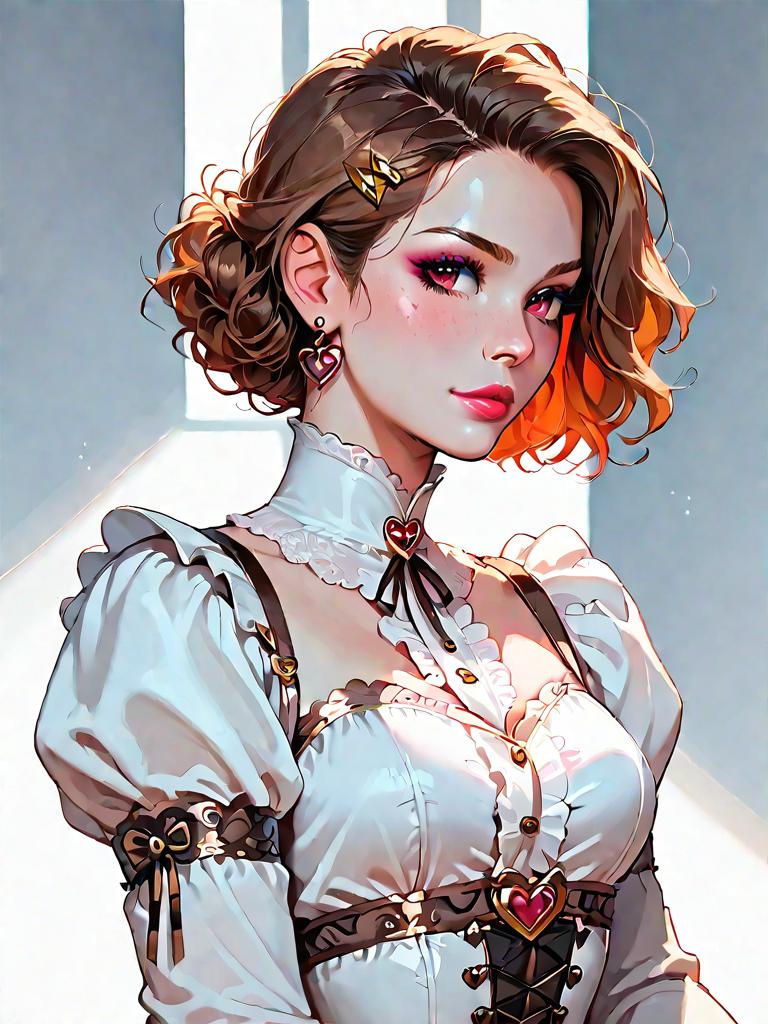 Portrait of a young woman with short wavy hair wearing a romantic vintage-inspired burgundy lace bodysuit, featuring intricate lace overlay, sweetheart neckline, long lace sleeves, and satin ribbon details with gold clips. The outfit includes a coordinating garter belt and highlights feminine charm and an alluring fit.