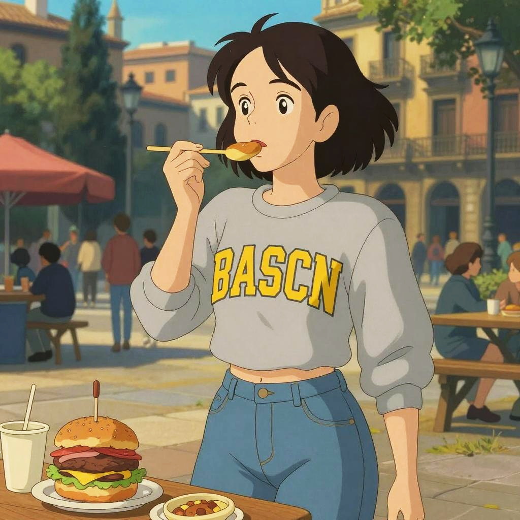 A woman, in a Studio Ghibli style, wearing a cropped grey sweatshirt with bold yellow lettering and high-waisted skinny jeans, enjoying gourmet street food in a vibrant Barcelona plaza. Sexy. Pretty face and beutiful eyes