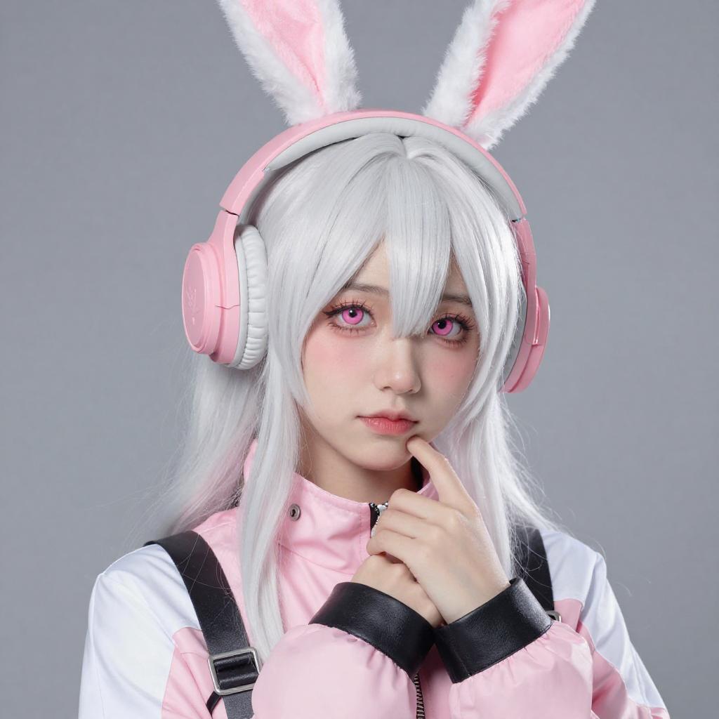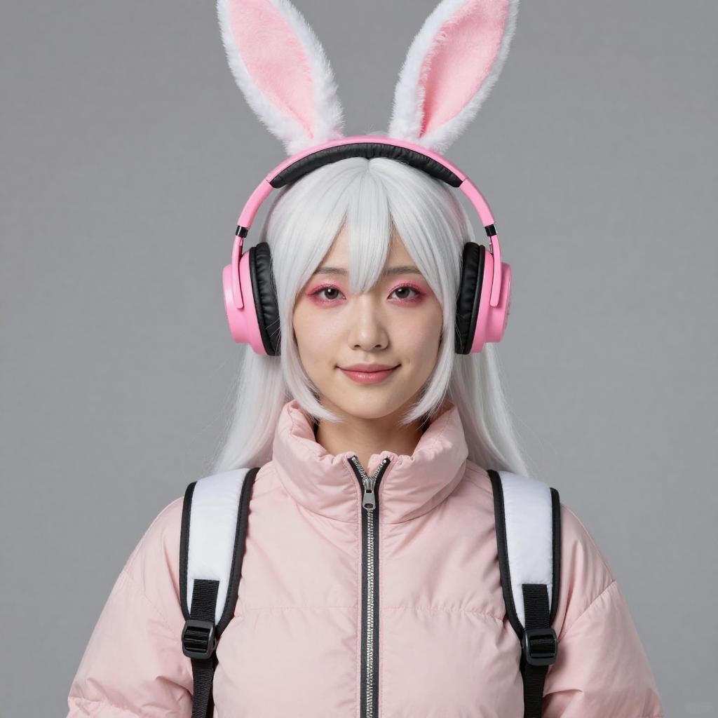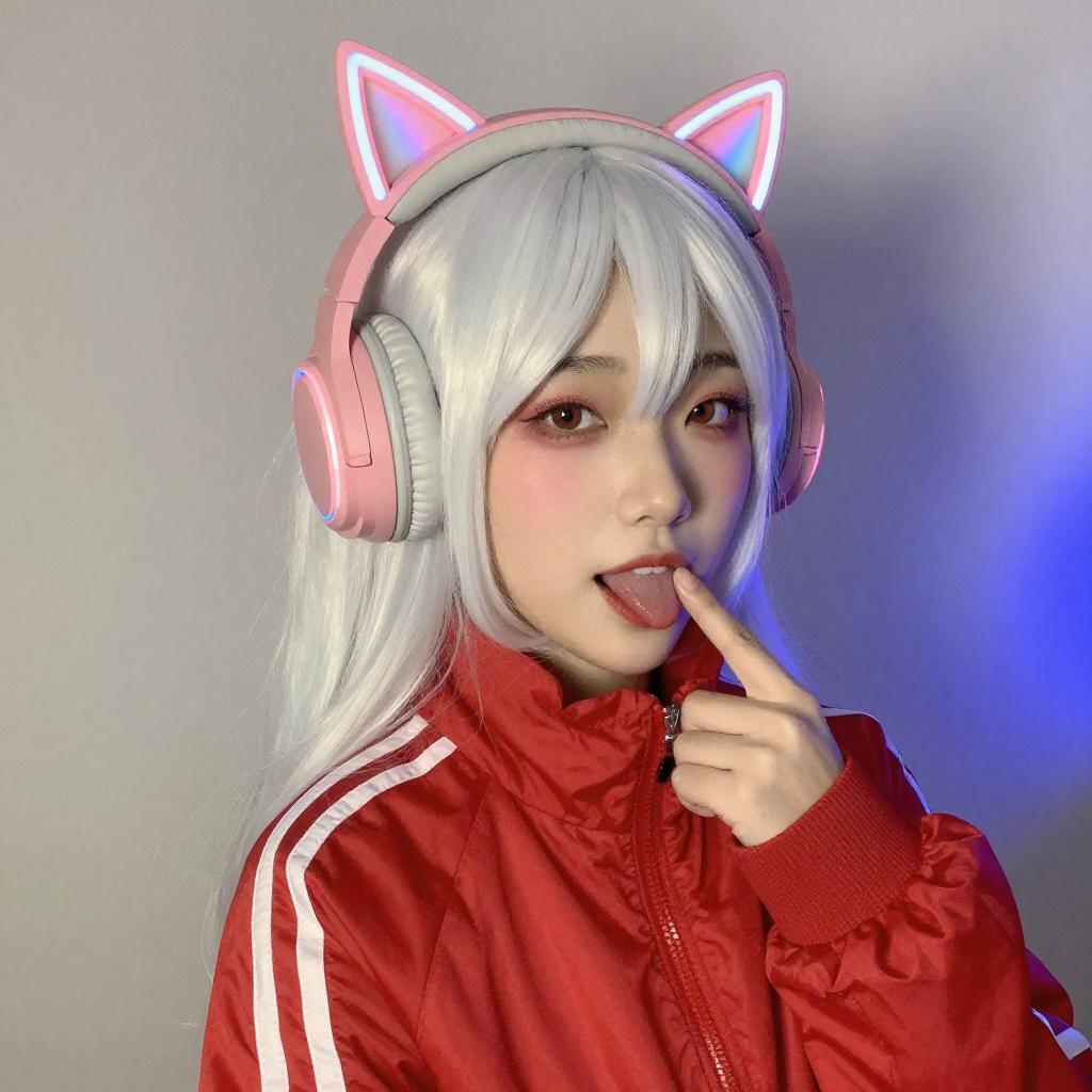 Photograph of a young woman with long, white, two-bun hairstyle, wearing a red, pixel-patterned jacket. She has light skin, pink eyeshadow, and holds pink, cat-ear headphones with a small screen on each ear. The background is a plain, light gray.