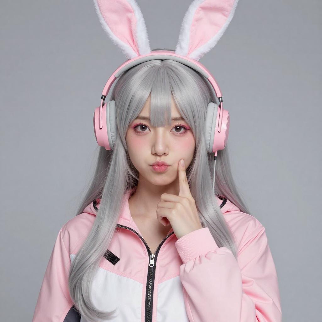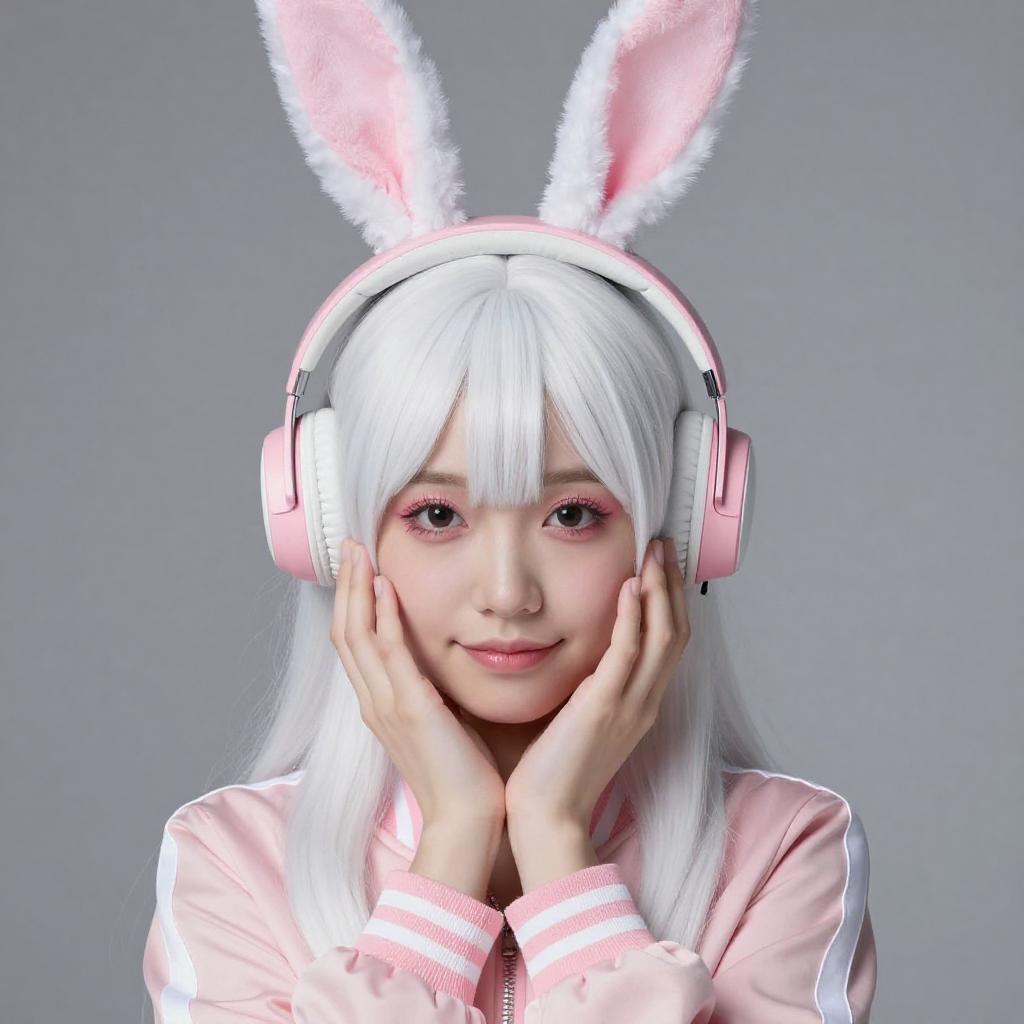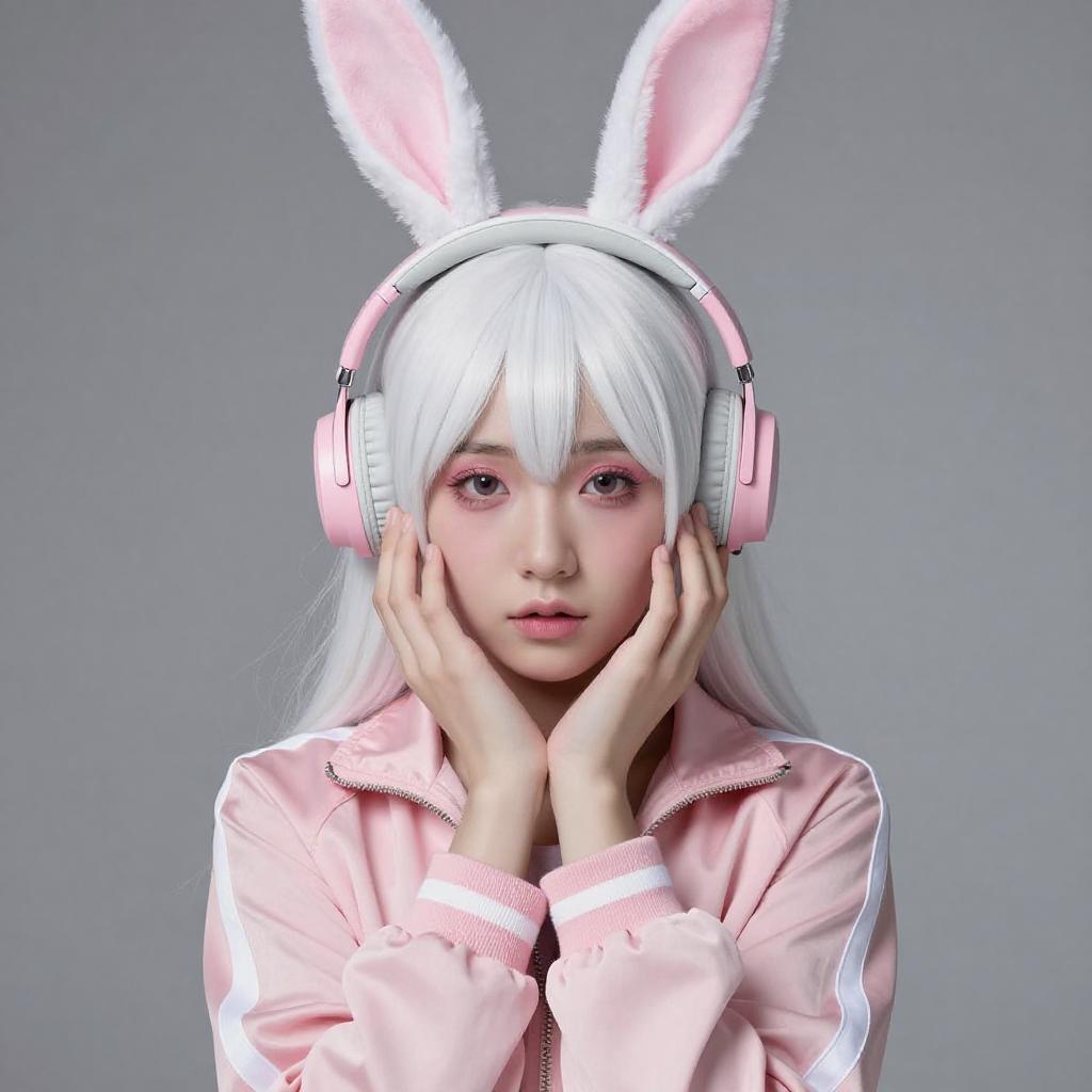Photograph of a young woman with long, white, two-bun hairstyle, wearing a red, pixel-patterned jacket. She has light skin, pink eyeshadow, and holds pink, cat-ear headphones with a small screen on each ear. The background is a plain, light gray.