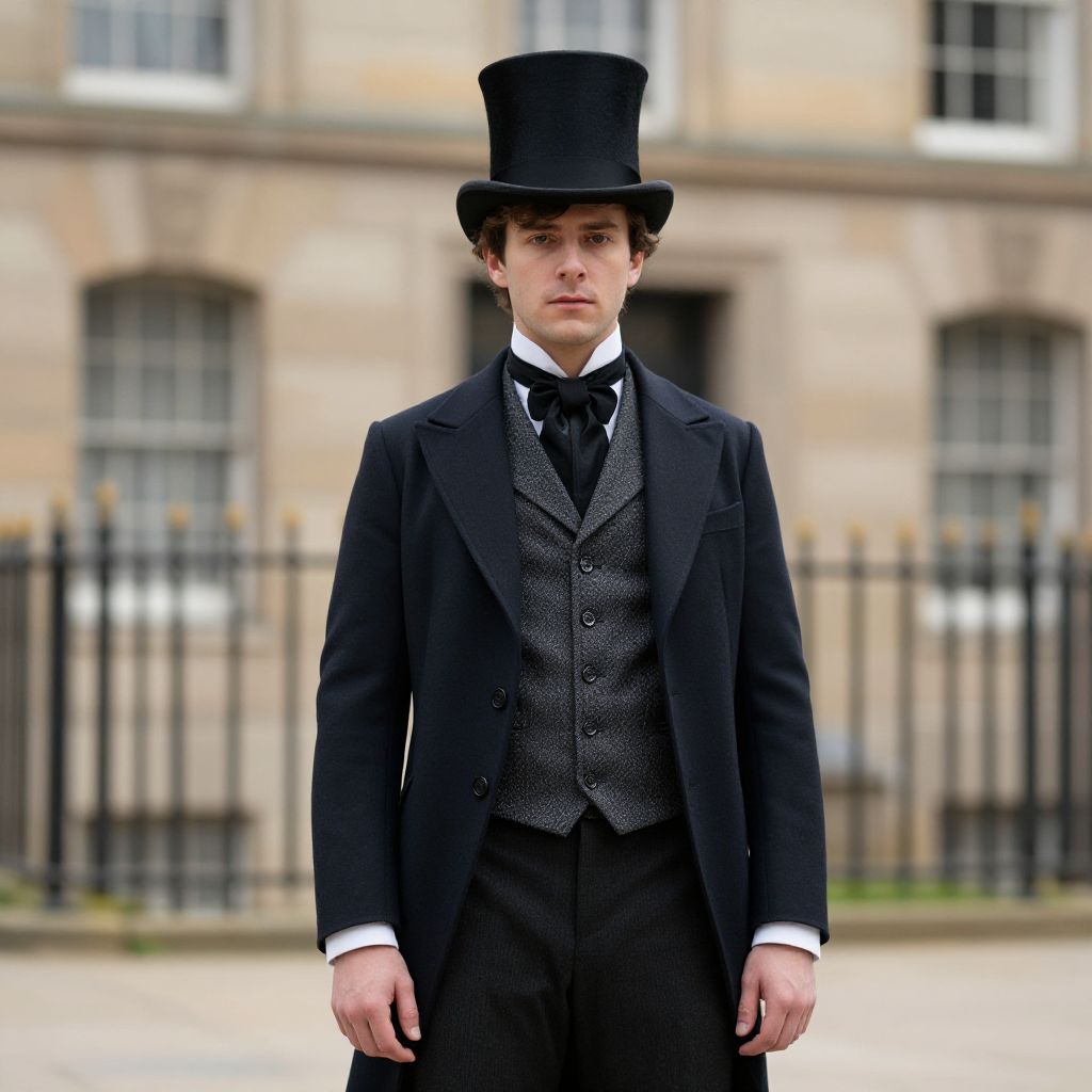 "Victorian Man Fashion Costume, man in a top hat and vest standing in front of a building"