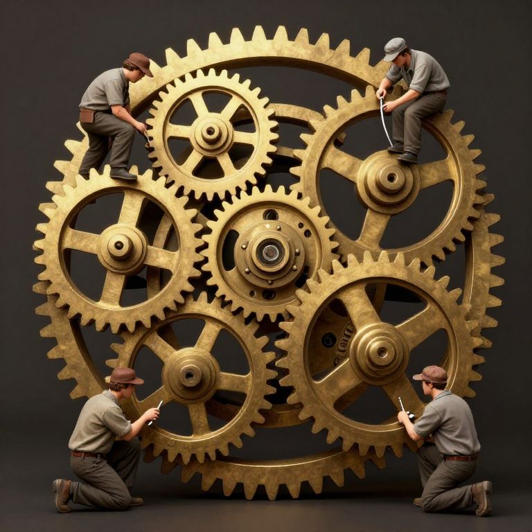 The image depicts a complex mechanical assembly, where four individuals are working as cogs in a grand machine. The central focus is a large, intricate gear system composed of various interlocking gears of different sizes and shapes, ranging from small circular cogs to larger, more complex components. The gears are primarily metallic, with a golden hue that gives them a polished, industrial appearance. The individuals, dressed in casual attire and hats, are positioned around the gears, each engaged in a specific task. One person is seated on a gear, operating a tool, while the others are kneeling or standing, manipulating smaller gears and components. The background is a dark, muted tone, which contrasts with the metallic sheen of the gears and highlights the intricate details of the mechanical assembly. The overall composition suggests a sense of teamwork and precision, as the individuals work in harmony to maintain or construct the complex machine.