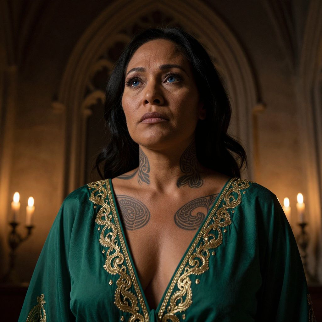 A highly detailed portrait photograph captures an enigmatic Melanesian woman. The image, taken from a low angle, emphasizes her ethereal beauty. Her wistful blue eyes, framed by raven-black hair, hold a quiet contemplation, with subtle creases around them hinting at both wisdom and sorrow. An intricate ancient tattoo adorns her neck and chest, complementing a flowing emerald gown with gold embroidery. The soft candlelight in the dimly lit, Gothic-inspired chamber adds a warm glow to the scene, illuminating the intricate patterns on the dress and casting dramatic shadows across her face. This contrast of light and dark enhances the emotional intensity of the portrait, evoking a sense of mystery and introspection.