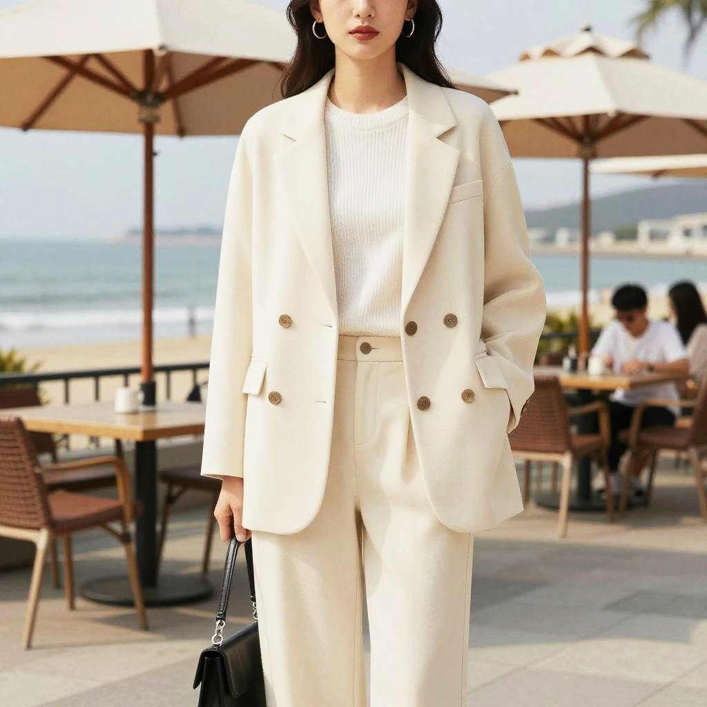 A woman, in a minimalist style reminiscent of toei animation, wearing an oversized cream blazer and straight-leg trousers over a white ribbed sweater, standing on a seafront promenade with outdoor cafes. Sexy. Pretty face and beutiful eyes