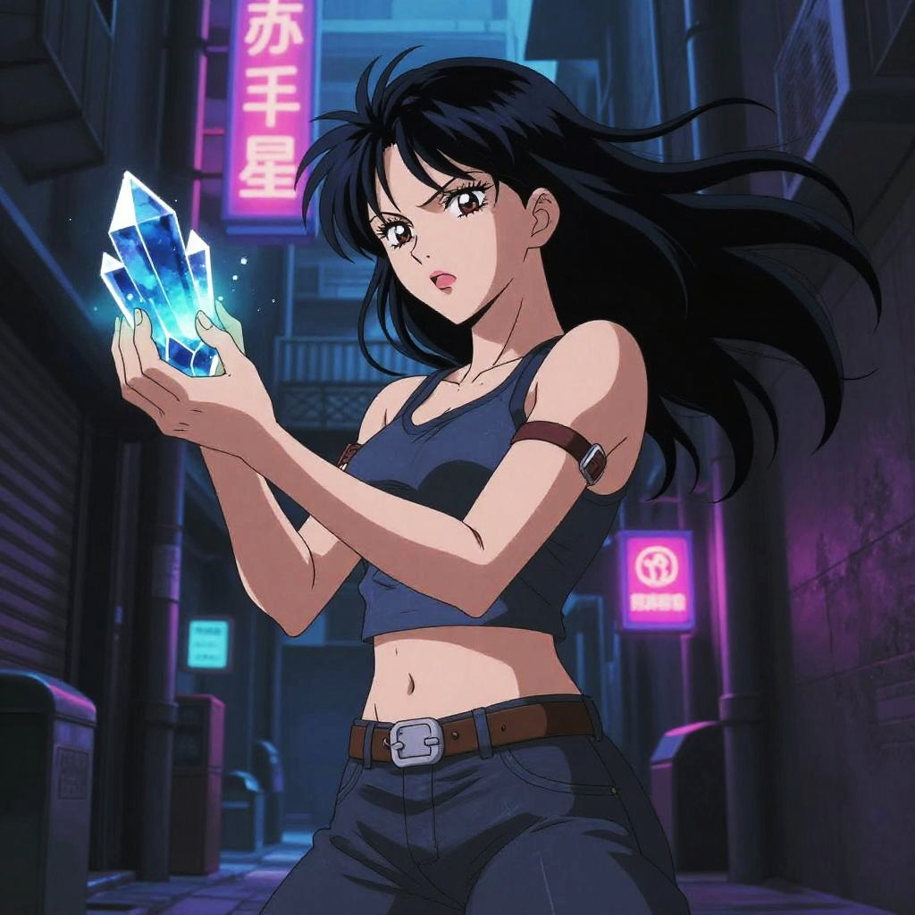 Walter White anime girl holding a crystal blue substance in her hand, she’s in a dark alley with neon lights glowing, dynamic pose, anime style with intricate shading and intense expressions