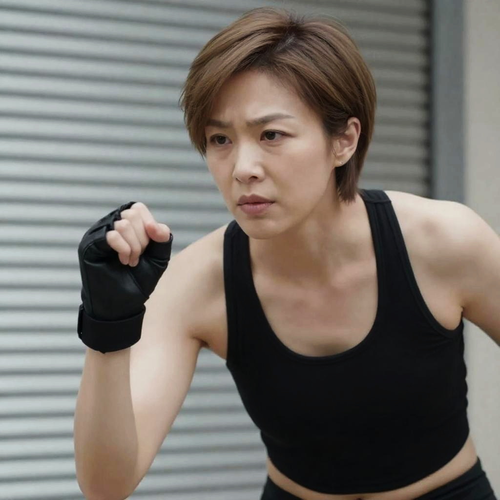 Photograph of a woman with brown hair, intense expression, holding a katana with a brown handle, wearing a maroon shirt. Her right hand grips the hilt, katana pointing forward. Background is blurred. Close-up shot.